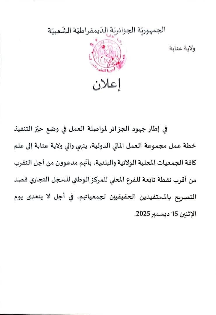 Cette démarche s’inscrit dans la continuité des efforts consentis par l’État algérien pour une meilleure organisation du travail associatif, notamment à travers l’application du plan d’action du Groupe d’Action Financière Internationale (GAFI), visant à lutter contre les pratiques illégales et à garantir la traçabilité des activités financières.
